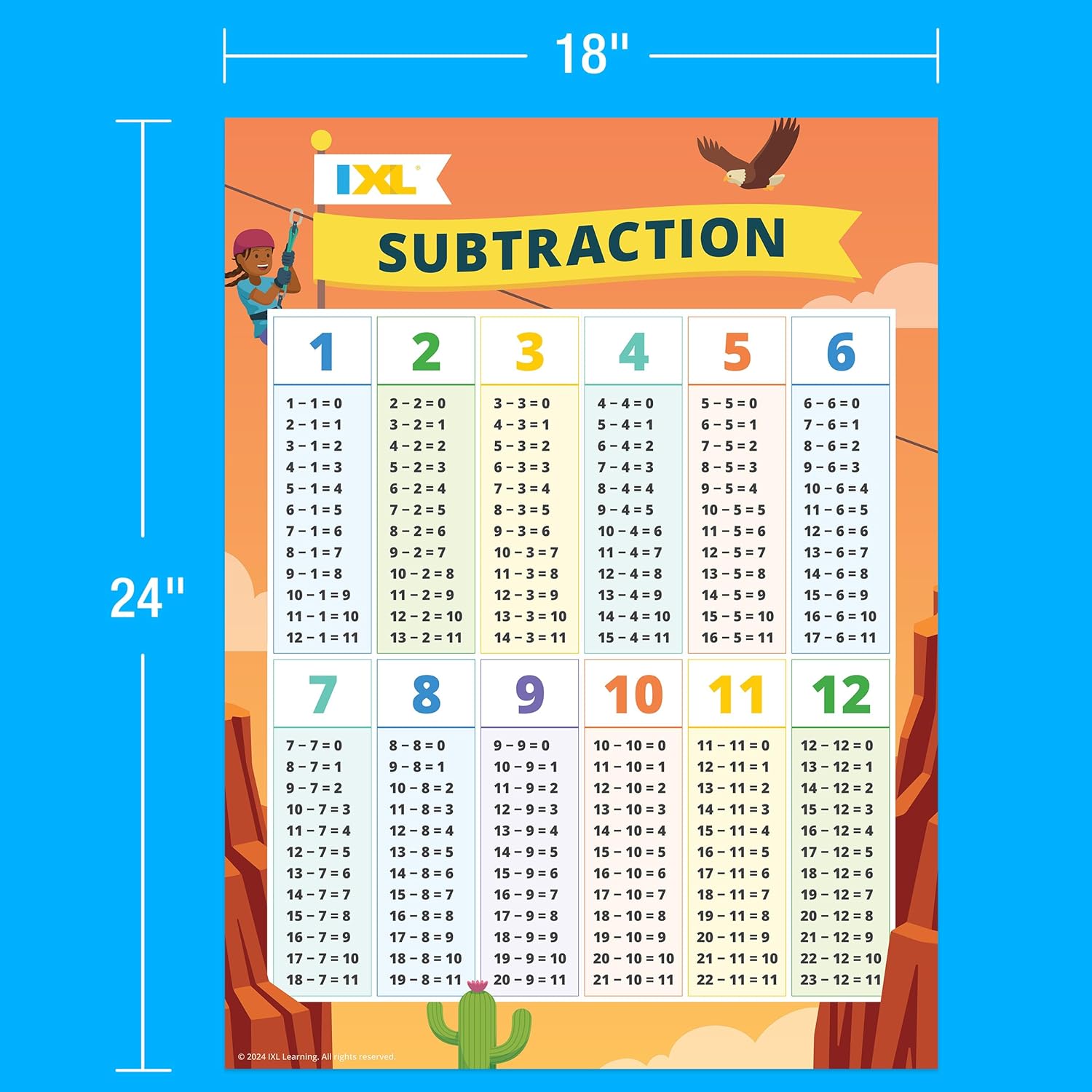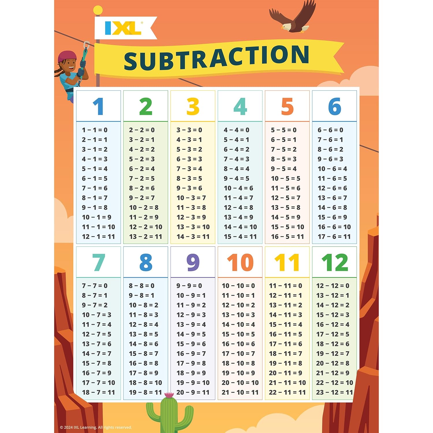 HABILIDADES MATEMÁTICAS IMPRESCINDIBLES: El póster de resta IXL presenta las restas esenciales para los números del 1 al 12. Perfecto para exhibir en casa o en el aula, este atractivo póster refuerza las restas para ayudar a los estudiantes a desarrollar confianza y rapidez mientras practican matemáticas.
