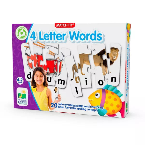 ¡Aprender a deletrear se vuelve divertido y fácil con Match It! ¡Palabras de 4 letras! Estos coloridos juegos de tarjetas de rompecabezas de cuatro letras brindan a los niños una excelente introducción a la ortografía y les ayudarán a ampliar su vocabulario. Aprenderán a deletrear asociando el objeto a la palabra y ensamblando correctamente las piezas del rompecabezas. ¡Las piezas del rompecabezas se autocorrigen, por lo que solo la ortografía correcta encaja! El juego incluye 20 juegos de rompecabezas.