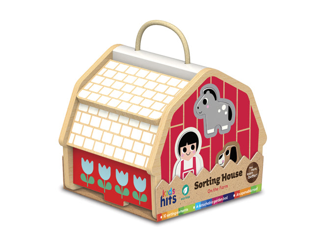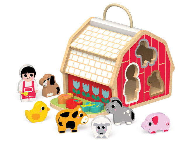 Los niños deben insertar cada una de las 10 piezas en los agujeros cortados de la casa de clasificación y el jardín. El set incluye 6 animales de granja y un granjero, que también pueden usarse por separado como juguetes para simular diferentes escenas de la granja.