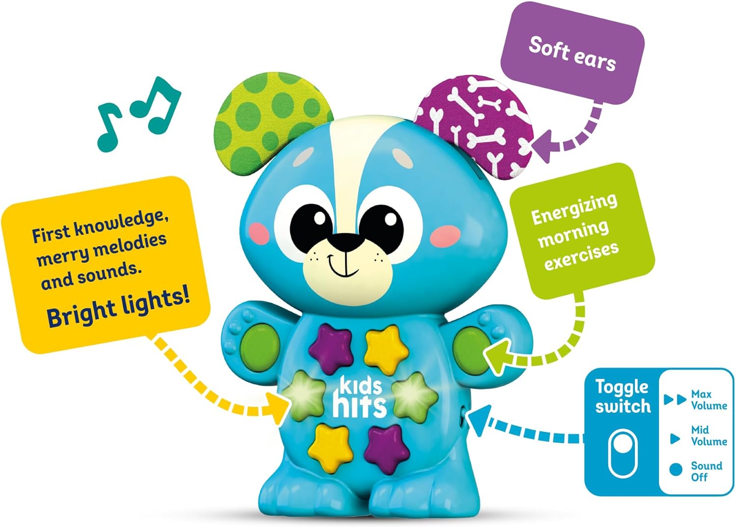 En Kids Hits, creemos que los primeros años son los más importantes para el aprendizaje, y el Cachorro Musical es el compañero ideal para esta emocionante y crucial etapa del desarrollo. Con divertidos sonidos, melodías y un mundo de funciones interactivas, este adorable cachorro estimula la curiosidad y el entusiasmo del niño por la música.