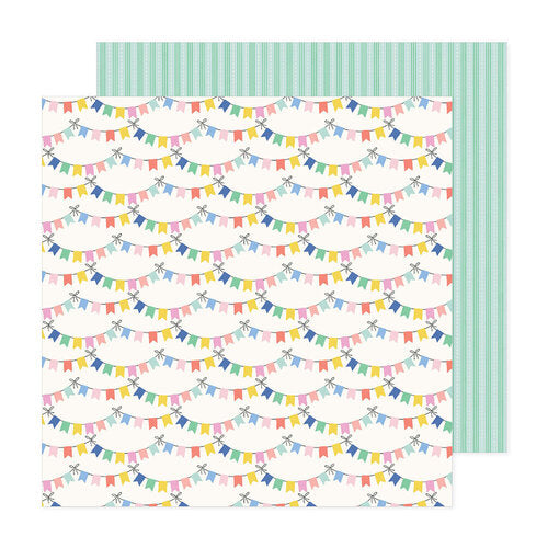Este papel de doble cara de 12" x 12" es parte de la colección Poppy and Pear diseñada por Bea Valint para American Crafts. El frente de este periódico está lleno de filas de pancartas coloridas. El reverso tiene un patrón de rayas verde y verde claro, así como una hilera de costuras blancas. Este papel se puede utilizar para tarjetas, páginas de álbumes de recortes, etiquetas, diarios y otros proyectos de manualidades con papel. Este papel no contiene ácidos ni lignina.