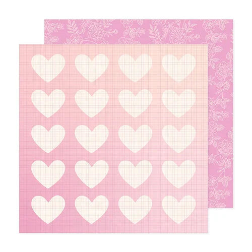 Este papel de doble cara de 12" x 12" es parte de la colección Poppy and Pear diseñada por Bea Valint para American Crafts. El frente de este papel tiene un color rosa degradado con corazones de color crema y una cuadrícula rosa encima de los corazones. El reverso es de color rosa oscuro y está lleno de grabados de flores y follaje de color crema. Este papel se puede utilizar para tarjetas, páginas de álbumes de recortes, etiquetas, diarios y otros proyectos de manualidades con papel. Este papel no contiene ácidos ni lignina.