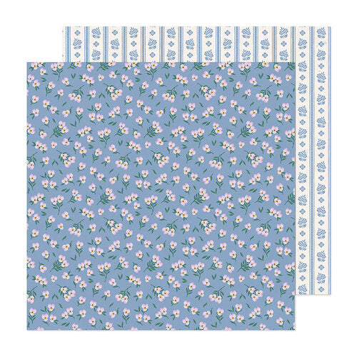 Este papel de doble cara de 12" x 12" es parte de la colección Woodland Grove diseñada por Maggie Holmes para American Crafts. El frente de este papel es morado y está lleno de pequeñas flores rosadas. El reverso es color crema y está lleno de hileras de flores azules con rayas azules en el medio. Este papel se puede utilizar para tarjetas, páginas de álbumes de recortes, etiquetas y otros proyectos de manualidades con papel. Este papel no contiene ácidos ni lignina. Este papel está fabricado en EE. UU.