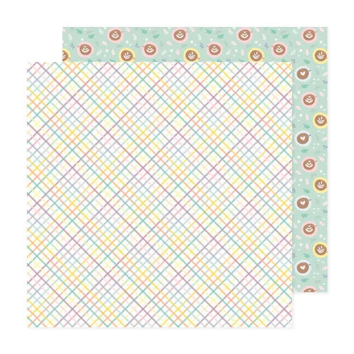 Este papel de doble cara de 12" x 12" es parte de la colección Rainbow Avenue diseñada por Celes Gonzalo para American Crafts. El frente de este papel tiene un diseño de cuadros diagonales. El reverso tiene un fondo verde claro y está lleno de una vista superior de tazas con arte de café. Este papel se puede utilizar para tarjetas, páginas de álbumes de recortes, etiquetas, diarios y otros proyectos de manualidades con papel. Este papel no contiene ácido.