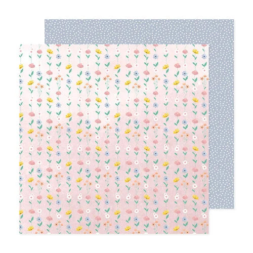 Este papel de doble cara de 12" x 12" es parte de la colección Rainbow Avenue diseñada por Celes Gonzalo para American Crafts. El anverso de este papel presenta pequeñas flores sobre un fondo rosa oscuro. El reverso es de color gris azulado y está lleno de pequeños puntos blancos. Este papel se puede utilizar para tarjetas, páginas de álbumes de recortes, etiquetas, diarios y otros proyectos de manualidades con papel. Este papel no contiene ácido.