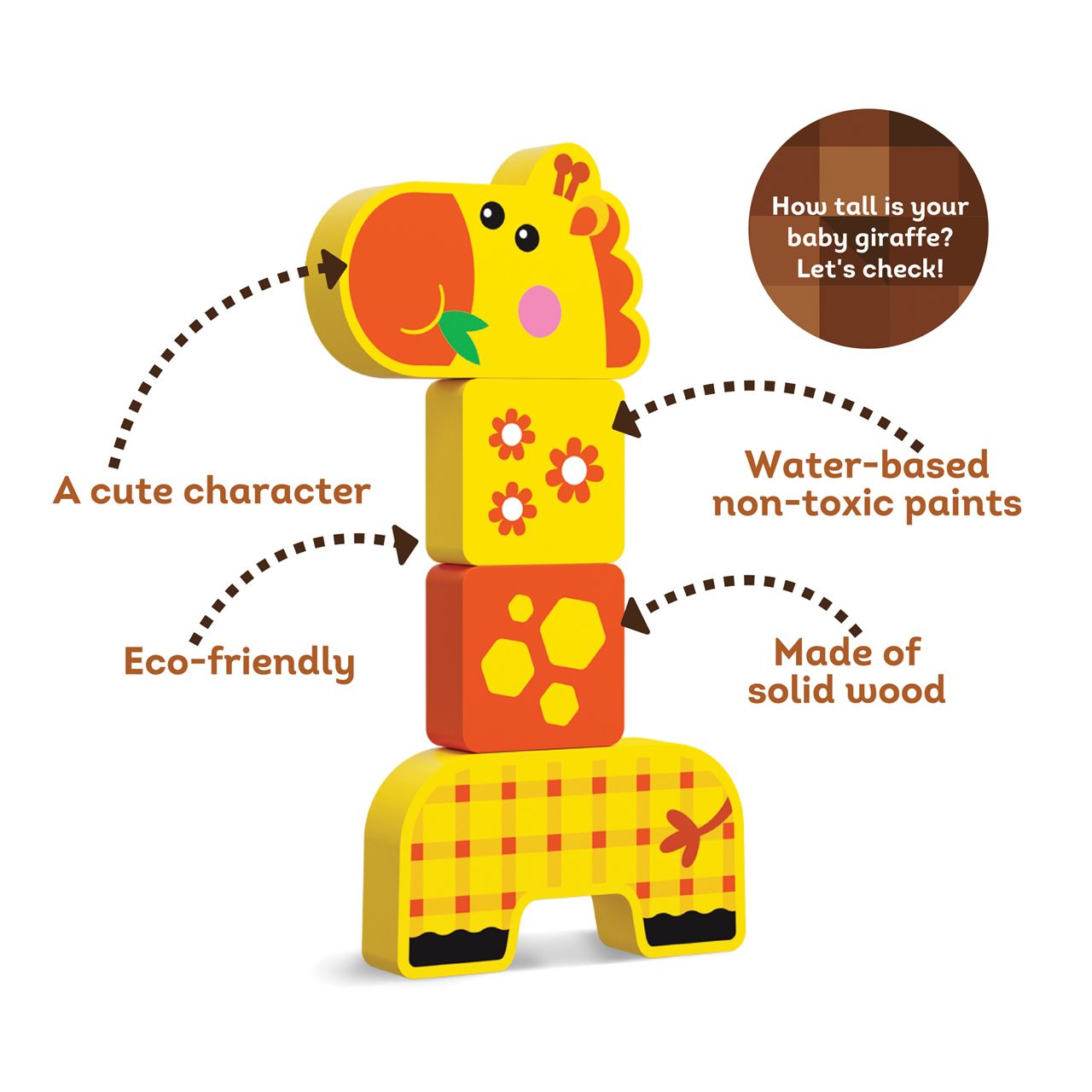 El juguete consta de cuatro piezas coloridas que los niños pueden combinar, apilar y equilibrar para construir su propia jirafa. Diseñados a la perfección para estimular la coordinación ojo-mano, el pensamiento lógico y la atención, los bloques son una introducción ideal a la percepción espacial y el desarrollo de la motricidad fina. Los colores brillantes y el divertido personaje de la jirafa cautivan la imaginación de los pequeños, convirtiendo apilar y construir en una experiencia encantadora.